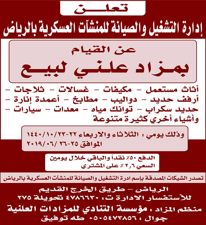 إدارة التشغيل والصيانة للمنشأت العسكرية بالرياض تعلن عن قيام مزاد علني