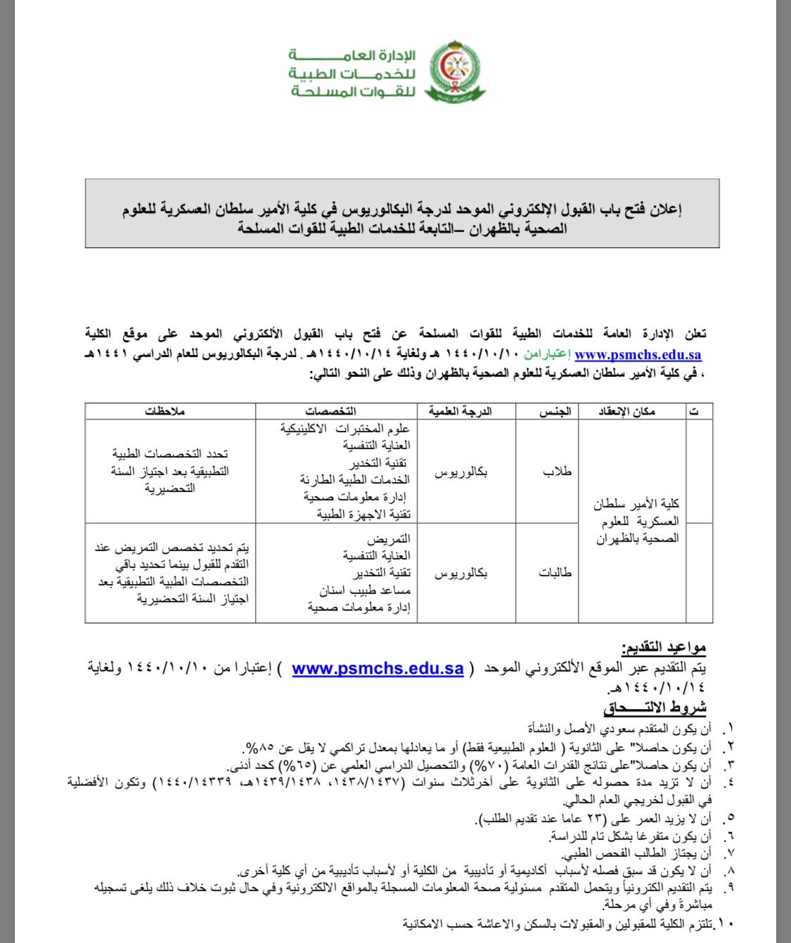 التمريض Nursing Pa Twitter تعلن الإدارة العامة للخدمات الطبية للقوات المسلحة عن فتح باب القبول الألكتروني الموحد على موقع الكلية Https T Co Ihqq62xqxb إعتبارا من 10 10 1440 هـ ولغاية 14 10 1440هـ لدرجة البكالوريوس في