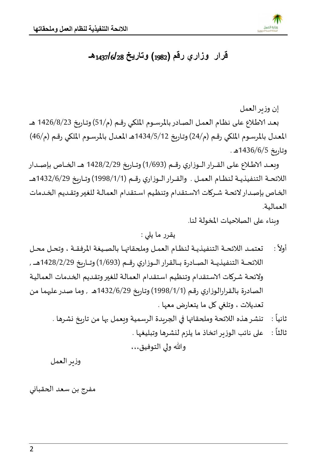 قرار وزاري بشأن اللائحة التنفيذية لنظام العمل وملحقاتها Pdf Docdroid