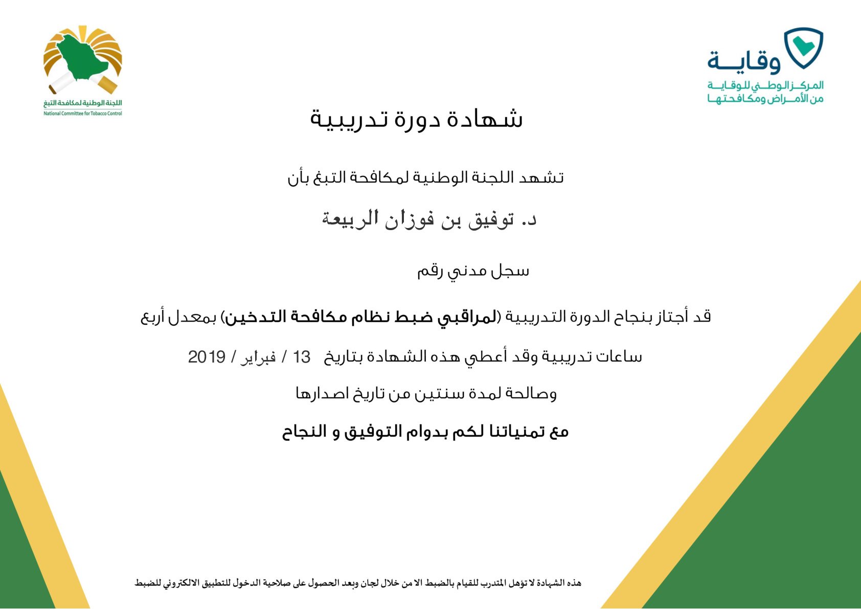 برنامج مكافحة التدخين On Twitter تشرفت اللجنة الوطنية لمكافحة التبغ بإصدار أول شهادة للتدريب عن بعد من خلال المنصة الإلكترونيه لمعالي وزير الصحة رئيس اللجنة الوطنية لمكافحة التبغ Https T Co Xt6xv0avsr