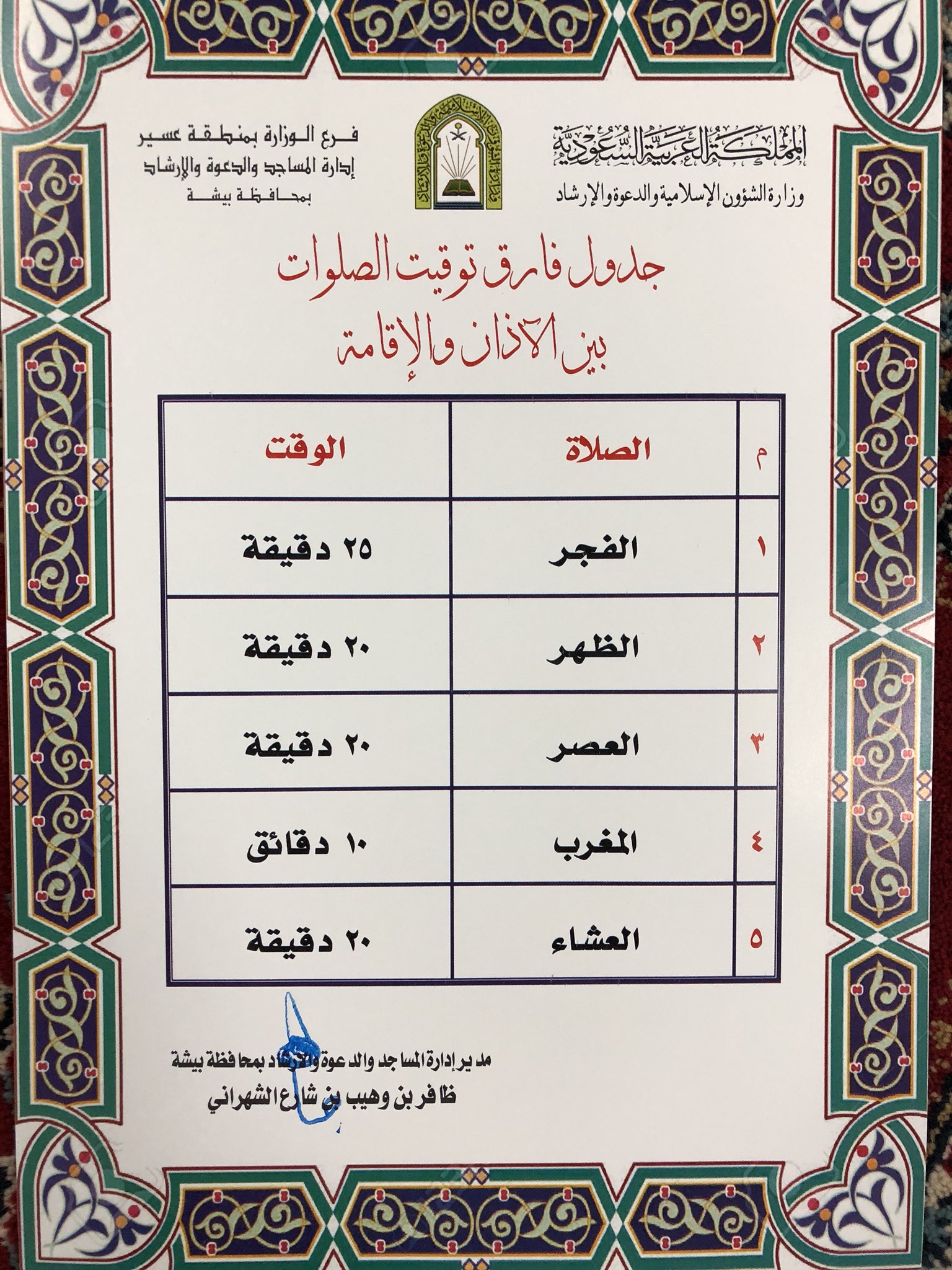 محمد بن معطش On Twitter مواقيت الصلاة بمحافظة بيشة وزعت ادارة المساجد والدعوة والإرشاد بمحافظة بيشة مشكورة على المساجد التابعة لها مواقيت الصلاة بالمحافظة حسب تقويم أم القرى وكذلك جدول فارق توقيت