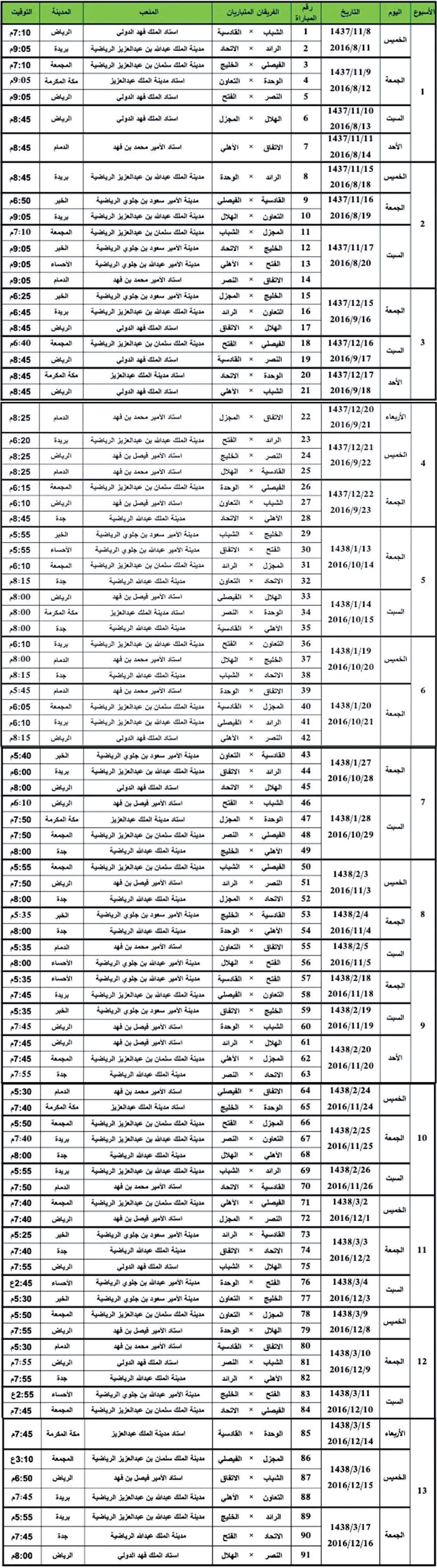 جدول دوري عبداللطيف جميل وكأس ولي العهد 1437 1438هـ